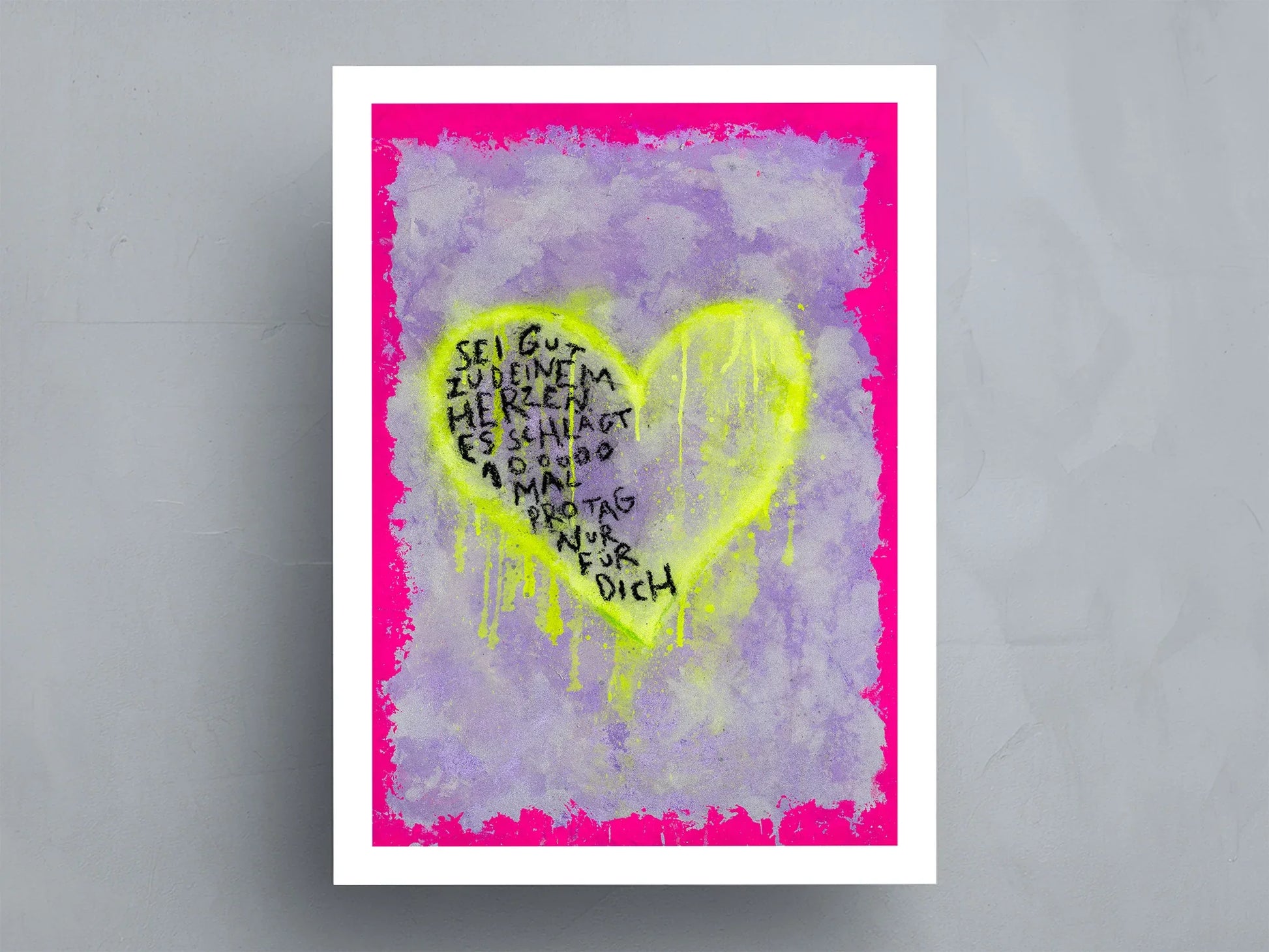 Jedes Kunstwerk, das du in meinen Händen hältst, ist von Anfang bis Ende ein Stück meiner selbst: Ich male, drucke, verpacke und verschicke jeden Print persönlich – mit viel Liebe zum Detail und einer Leidenschaft, die in jedem Schritt spürbar ist. Als kleines Dankeschön lege ich zu jeder Bestellung immer eine Postkarte und einen Sticker bei, um dir ein Lächeln zu schenken.